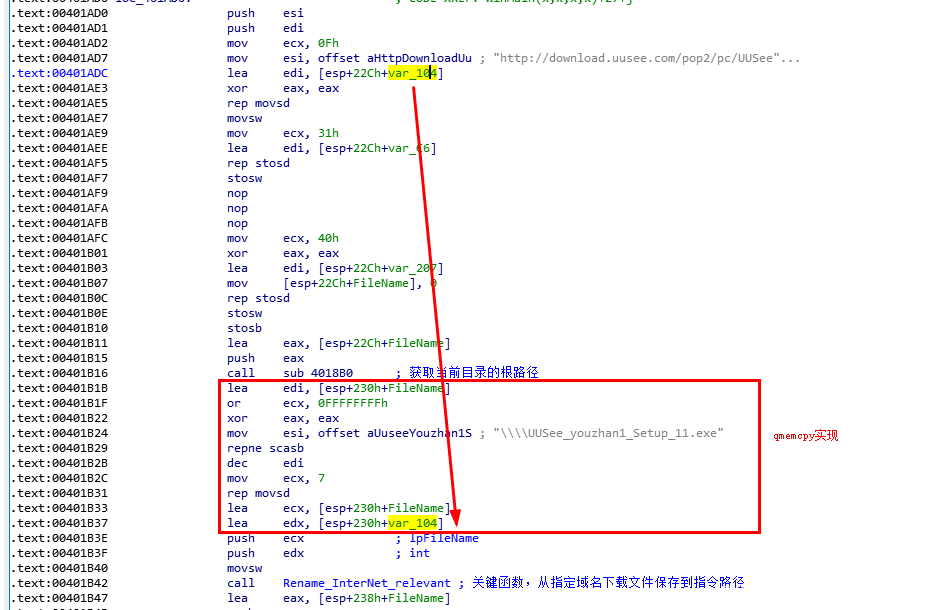 我们回到WinMain函数中,红框部分是qmemcpy的汇编实现,用于将aUuseeYouzhan1S拼接到[esp+230h+FileName]