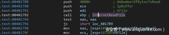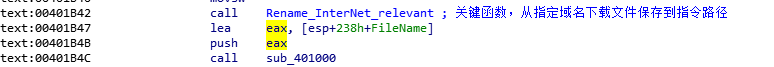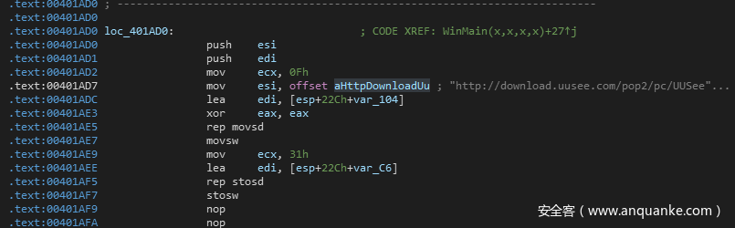 我们可以看到,在loc_401AD0处,程序首先通过 mov esi,offset aHttpDownloadUu 将我们之前看到的URL地址在内存中的地址赋值给了esi寄存器。此时esi寄存器将会指向这个下载地址。