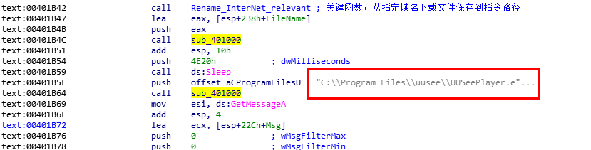 这个路径就是我们最开始在行为分析中看到的路径,经过分析,我们发现在此样本中并为访问该路径,结合sleep函数,我们可以猜测,本样本通过网络请求下载回来的样本应该是第二阶段的Downloader或者Dropper,执行之后,会下载或释放第二个样本保存到C:Program FilesuuseeUUSeePlayer.exe,然后在这里通过sub_401000函数执行。