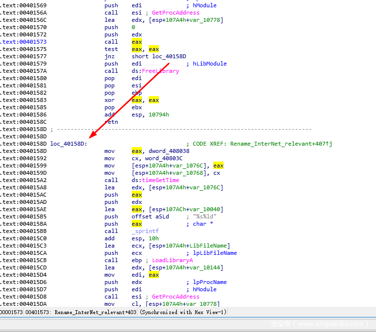 获取成功之后,程序call eax调用InternetGetConnectedStats,接着判断eax是否为0,如果不等于0则说明调用成功,跳转到loc_40158D继续执行,如果eax等于0说明函数调用失败,则在后面调用FreeLibrary释放Library然后退出函数。