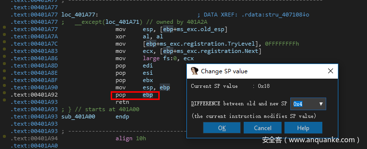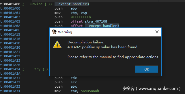 这里提示401A92:positive sp value has been found