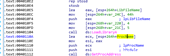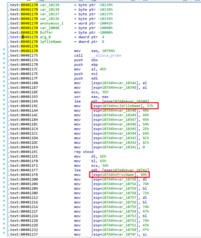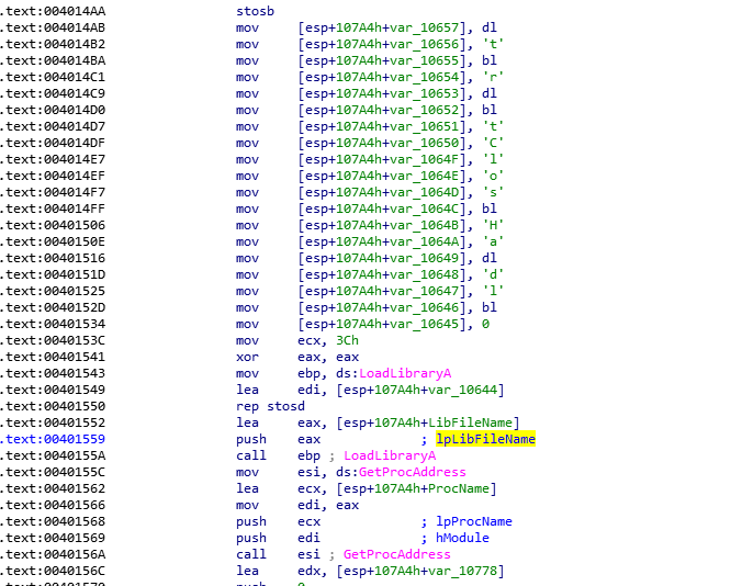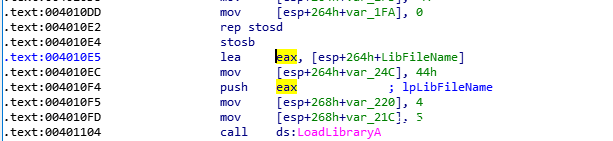 且可以看到在0040103C处开始对局部变量LibFileName赋值。