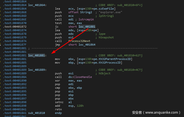 如果找到的话,则跳转到loc_401881继续执行,将explorer.exe进程的信息存放到ebx和ebp中。