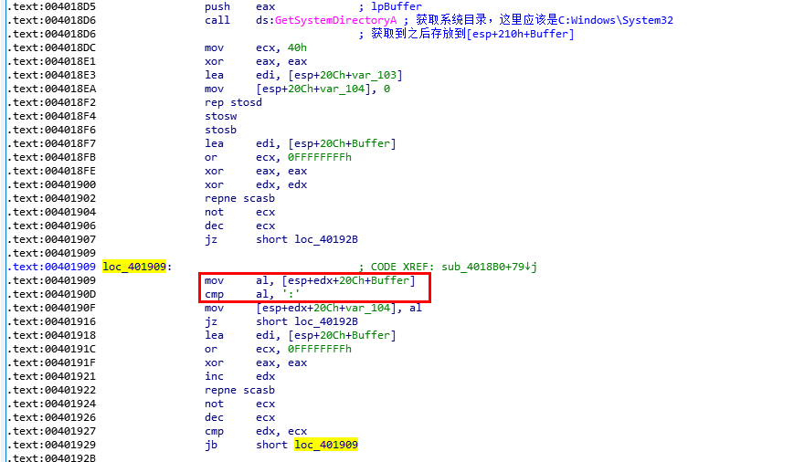sub_4018B0的主要功能是获取windows的目录信息,可以看到通过GetSystemDirectoryA获取到系统路径之后,程序会将其存放到[esp+210h+Buffer],然后在下面通过循环,只取冒号之前的内容。 所以这里最后会返回一个系统的根路径。C:(分析到这里换了一个环境,所以IDA修改为白色了)