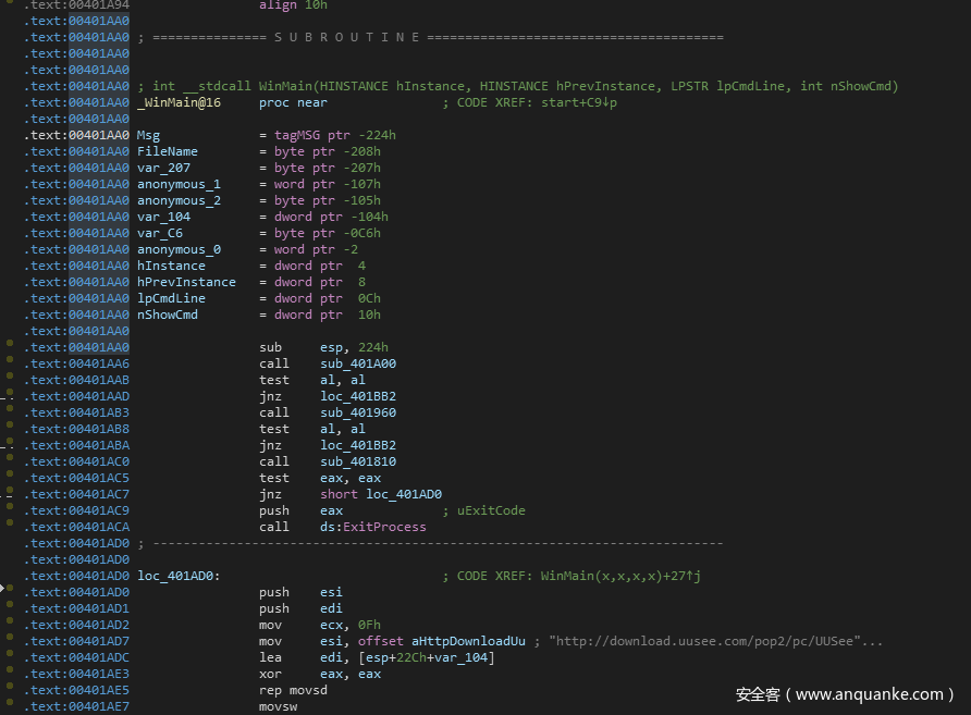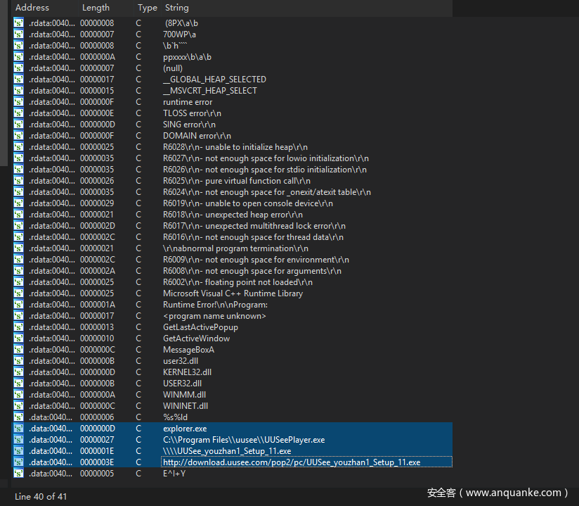 比如样本有可能会通过InternetReadFile函数从hxxp[:]//download.uusee.com/pop2/pc/UUSee_youzhan1_Setup_11.exe读取文件并保存到本地路径的C:Program FilesuuseeUUSeePlayer.exe,然后在sub_401000函数中启动这个文件。