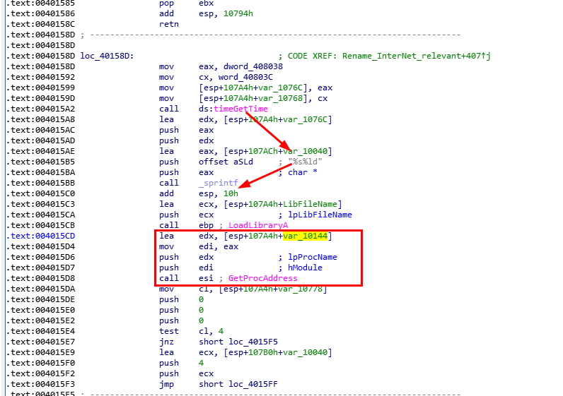 跳转过来执行后,程序首先通过timeGetTime获取时间,以%s%ld作为格式化,然后尝试通过GetProcAddress获取var_10144的地址。