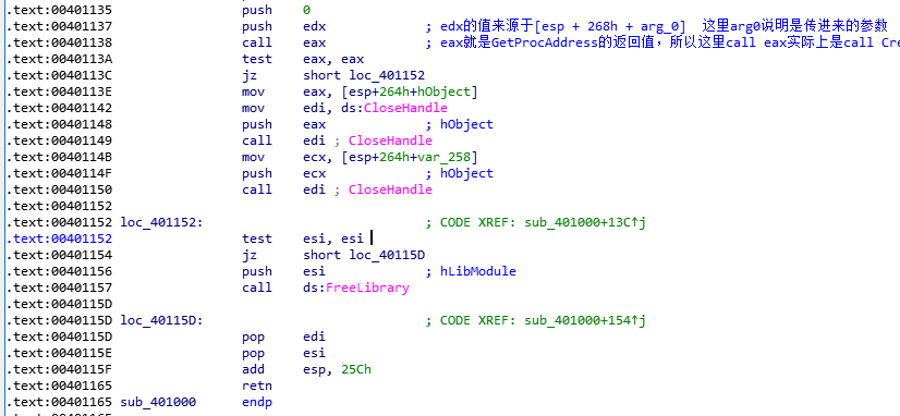 然后通过call eax的方式,创建edx进程,dex来源于参数。由此可以得知,00401000函数的确用于创建进程,和我们最开始的猜想保持一致。