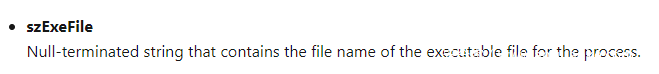我们之前已经知道了pe是PROCESSENTRY32类型的结构体,所以我们到微软的官网中查看PROCESSENTRY32的结构,其中提到了szExeFile表示进程中可执行文件的文件名。