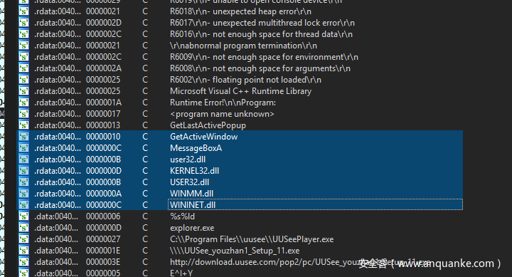 由于导入表中已经没有更多的可疑函数了,接下来,我们分析一下strings表