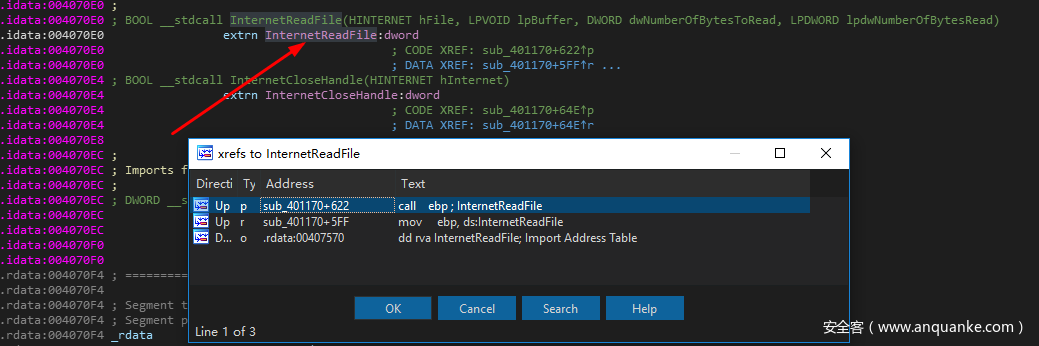 我们可以双击进入该函数,然后在InternetReadFile上按下X,查看交叉引用