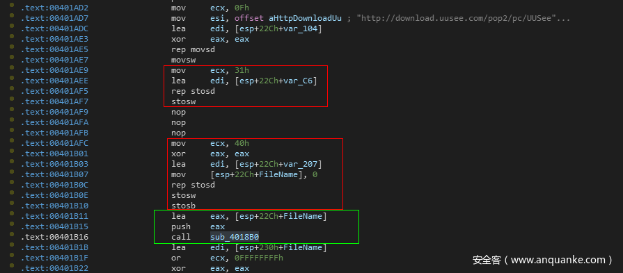 赋值成功之后,程序通过lea指令取了[esp+230h+FileName]和[esp+230h+var_104]的值分别存放到了ecx和edx中,然后将这两个寄存器作为参数传递到了之前我们分析的网络请求函数中。此时ecx存放的就是文件的保存路径C:UUSee_youzhan1_Setup_11.exe,edx存放的是请求下载的地址。