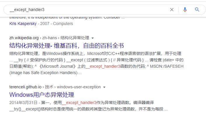 我们之前讲过,双下划线开头的,一般都是系统的,所以我们直接对__except_handler3进行查询: