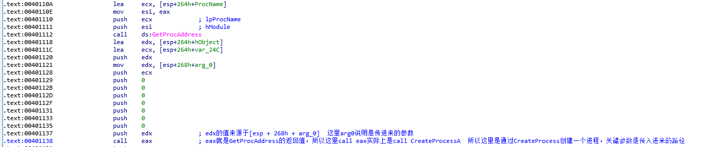 接下来是给ProcName赋值。同样的,经过分析,不难看出ProcName = CreateProcessA