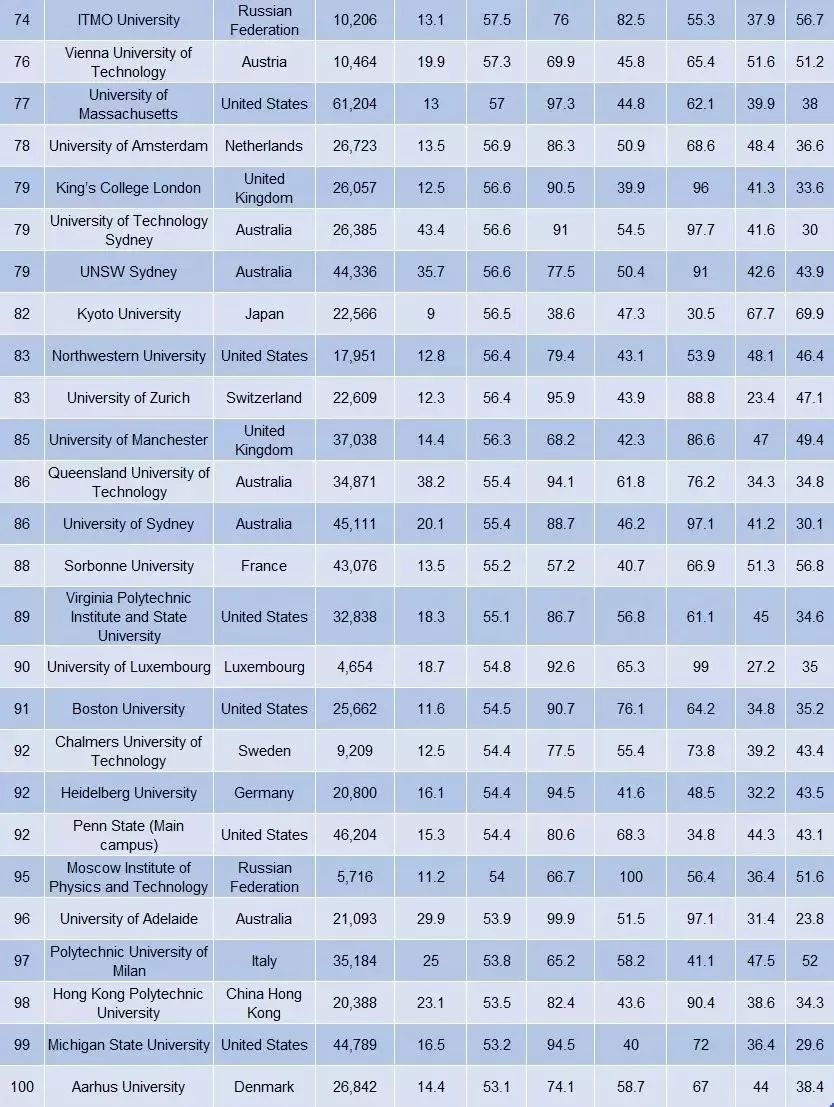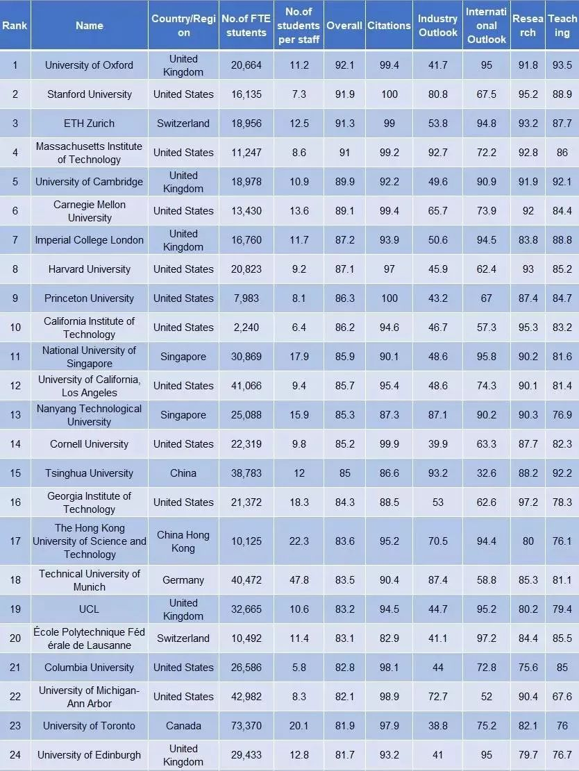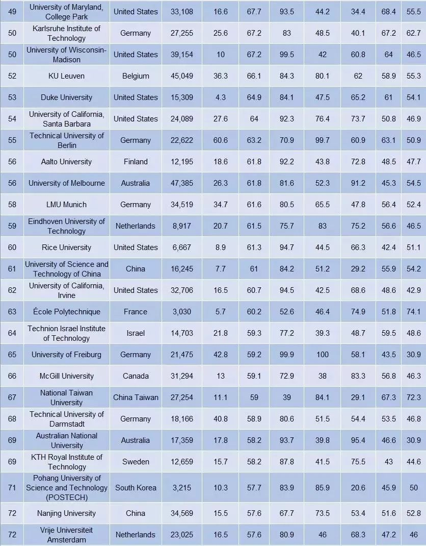 中国共有 11 所高校进入前 100 榜单。其中,排名最高的是清华,排在全球第 15 位;其次是香港科技大学,排名 17 位。接下来进入 TOP50 的依次是北京大学(27)、香港中文大学(36)、香港大学(38)、浙江大学(41)、上海交通大学(45)。排在 50 至 100 位依次是,中国科学技术大学(61)、台湾大学(67)、南京大学(72)、香港理工大学(98)。