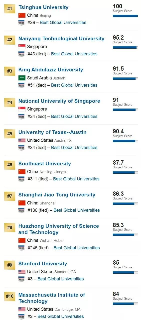 在前 10 的大学中,清华大学高居榜首,东南大学位居第 6 位,上海交通大学位居第 7 位,华中科技大学位居第 8 位。除了以上 4 所高校外,浙江大学排名全球 11,北京大学排名全球 16。而这份计算机科学全球大学排名前 100 名中,中国共计有 28 所大学进入榜单。