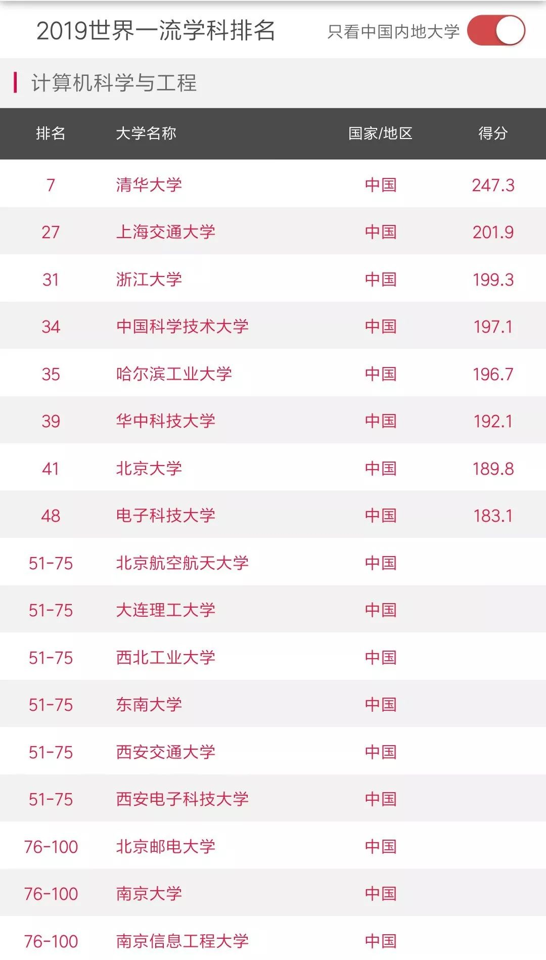 进入 QS 2019 年计算机科学专业排名前 100 榜单的中国高校共有 15 所。其中,清华大学、北京大学位列 15、18 位,香港科技大学 26 位,香港大学 33 位,香港中文大学 36 位,上海交通大学 38 位,台湾大学 49 位。排在第 50-100 位的中国高校还有以下 7 所:香港城市大学、复旦大学、南京大学、国立交通大学、国立清华大学、中国科学技术大学、浙江大学。