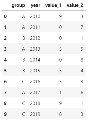 df = pd.DataFrame({'group':groups, 'year':years, 'value_1':values_1, 'value_2':values_2})