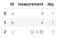 df1 = pd.DataFrame({'id':id, 'measurement':measurement, 'day':day})