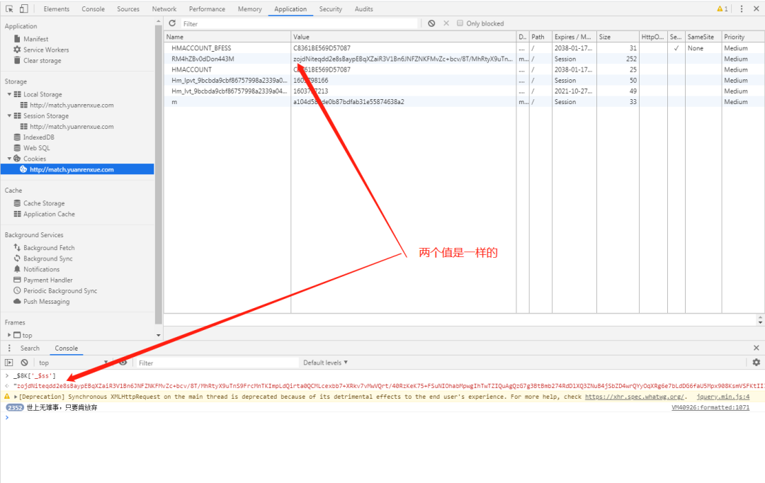 取消断点,让程序彻底跑起来,比对cookie值,发现是一样的: