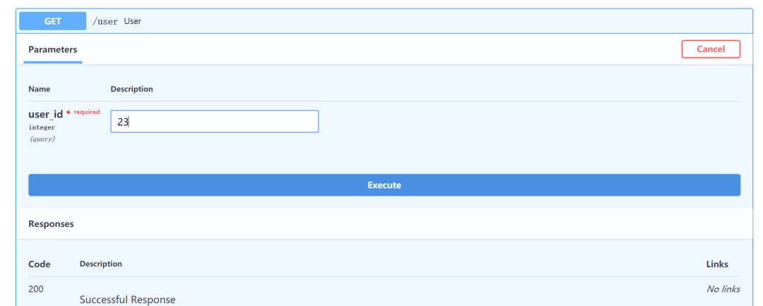 下面我们可以访问一下刚才写的user接口,我们需要传入参数userid(指定整数类型),即可拿到返回值。