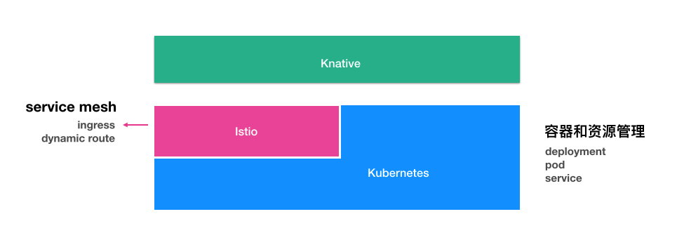 knative 建立在 kubernetes 和 istio 平台之上,使用 kubernetes 提供的容器管理能力(deployment、replicaset、和 pods等),以及 istio 提供的网络管理功能(ingress、LB、dynamic route等)。