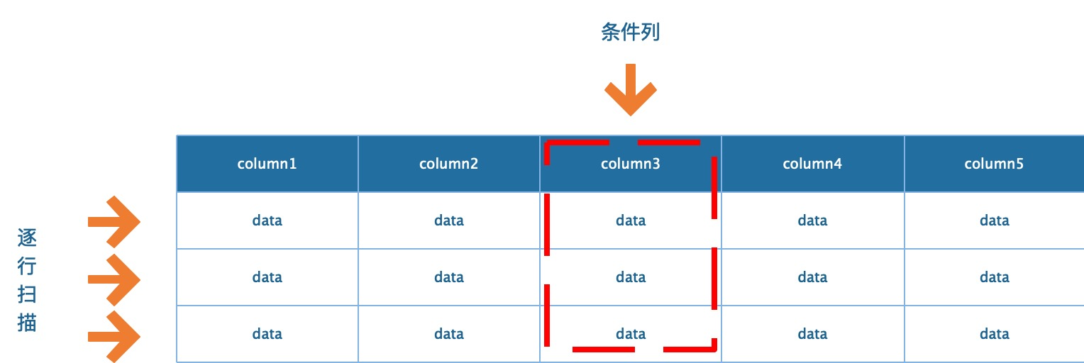 在进行数据库检索时,尤其是条件查询,解析SQL指令后,本质上是对数据存储文件的扫描。我们所使用的绝大部分关系型数据库的表结构采用的都是行式存储,也就是一条数据是一行,每一列的数据是在这一行中以某种分隔符来分隔。数据库在进行数据扫描时也是通过游标(cursor)以行为单位来进行操作,与之相对的就是列式存储(column table),比如HANA。
