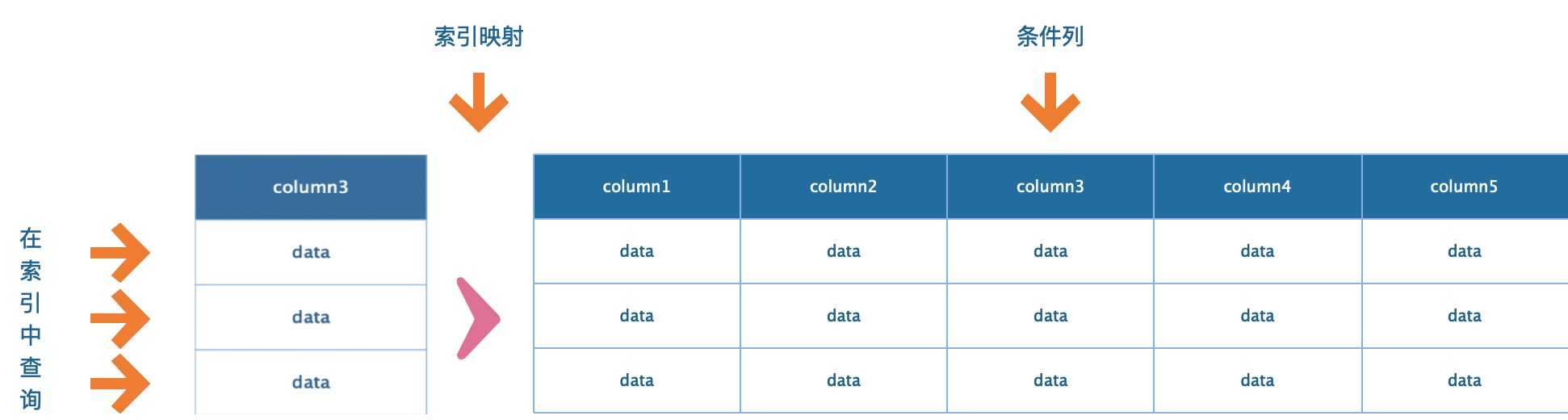 如果我们将一条数据比作一页,每列数据就相当于这一页的内容。这时我们使用索引就可以建立起某列数据与某一条数据的关系,也就是说给定一个查询条件和信息,我就能够定位到数据的所在位置。