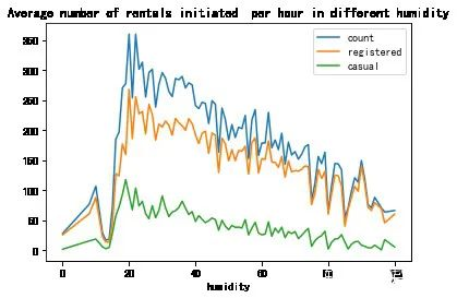 humidity_df.plot(title='Average number of rentals initiated per hour in different humidity')
