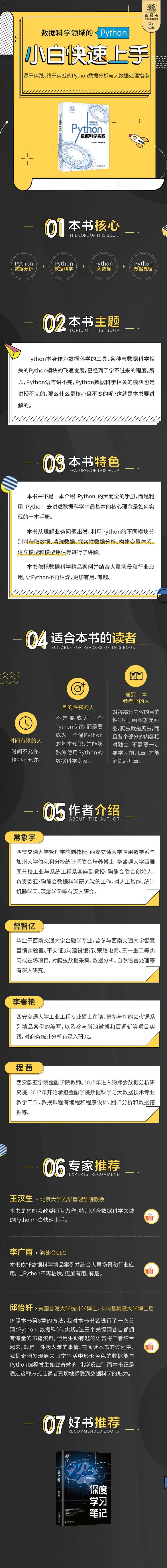 《Python数据科学实践》是由狗熊会推出的一本利用Python介绍数据科学基本过程的著作。本书以Python语言为基础,介绍利用Python进行数据科学研究与商业分析的全貌。其核心的设计理念是通过经典的商业应用案例对数据爬取、数据存储、数据清洗、数据建模的核心Python模块做相应的介绍。