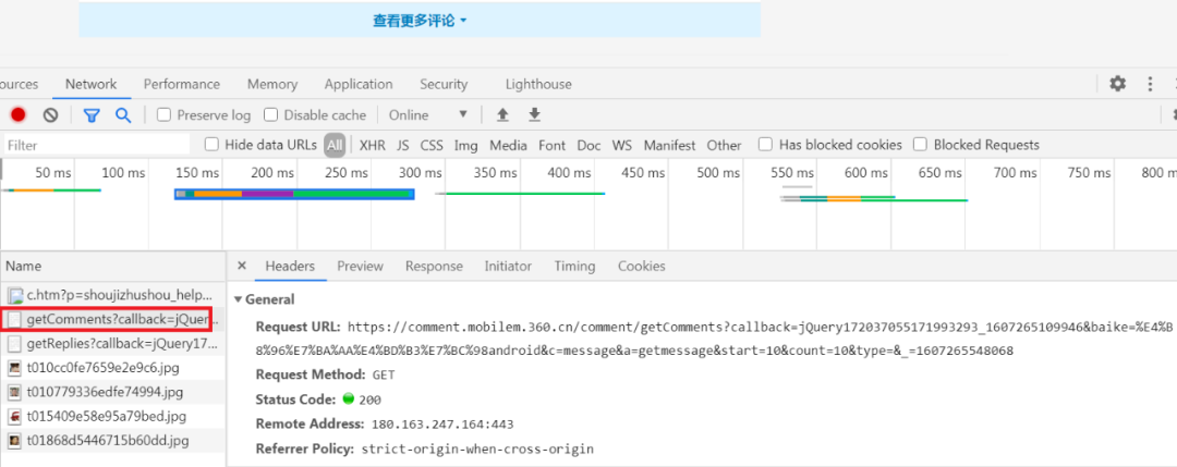 此时打开开发者工具并选择Network项,点击查看更多评论,然后可以看到getComments请求,如图所示: