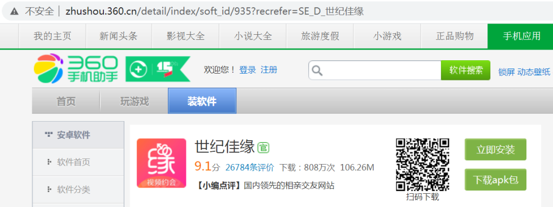 本文以 360 手机助手为例,地址为:http://zhushou.360.cn/,相亲软件选择 3 个比较流行的,分别为:世纪佳缘、百合婚恋、有缘网,我们使用 Python 爬取软件评论区,看看用户评价情况。