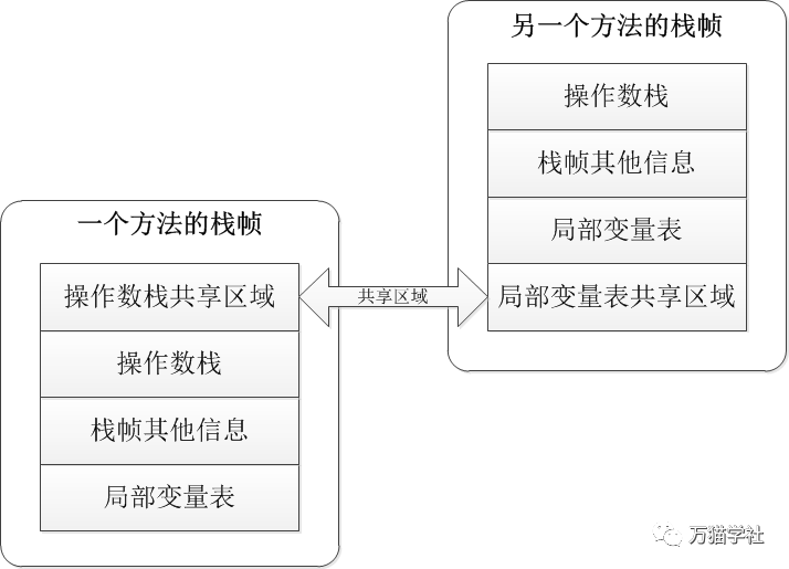 一个方法调用另外一个方法时,可以通过操作数栈来进行方法参数的传递。虽然在Java虚拟机规范中,两个不同栈帧作为不同方法的虚拟机栈的元素,是完全相互独立的。但是在大多Java虚拟机的实现是,都会进行一些优化:两个不同方法的栈帧出现一部分重叠。让下面栈帧的部分操作数栈与上面栈帧的部分局部变量表重叠在一起,这样做不仅节约了一些内存空间,更重要的是在进行方法调用时就可以直接共用一部分数据,不需要进行额外的参数复制和传递,如下图: