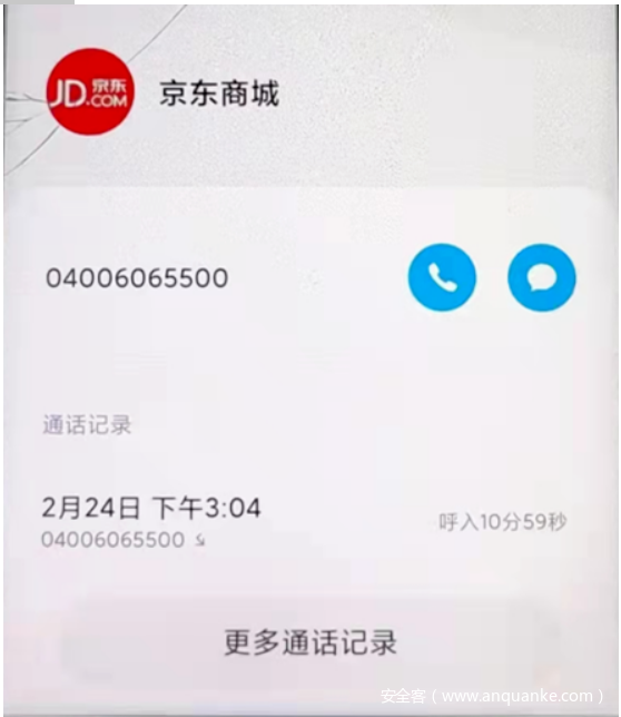1.受害人接到标注为京东客服的4006065500、4006568800电话,或显示为021-95118、025-95118、0571-95118的电话,以及普通手机号(含虚拟运营商号码)电话。