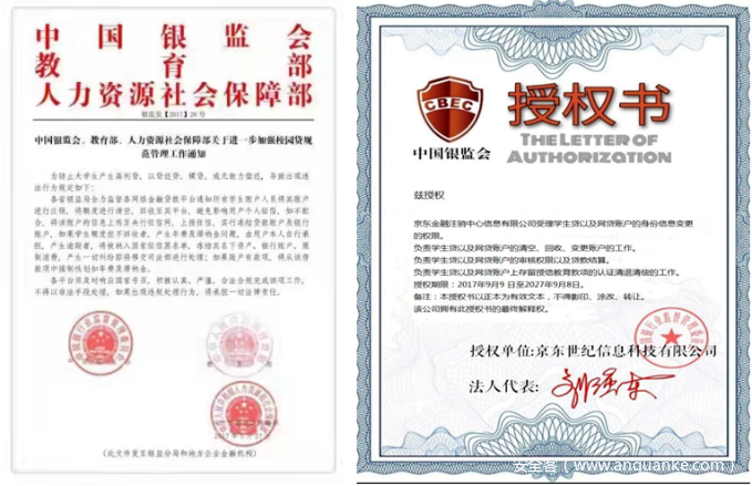 二是诈骗分子获取登录验证码后,假冒受害人身份在客服对话界面发布伪造的京东金融工作证、京东公司授权处理校园贷证书、银监会等部门加强校园贷管理的通告等内容,让受害人误以为对方确实是客服,基本打消顾虑。