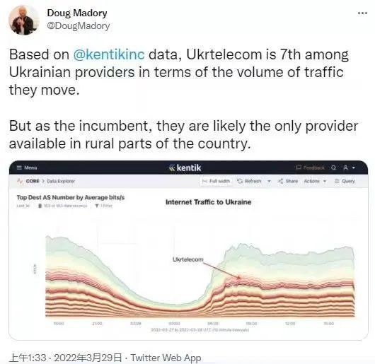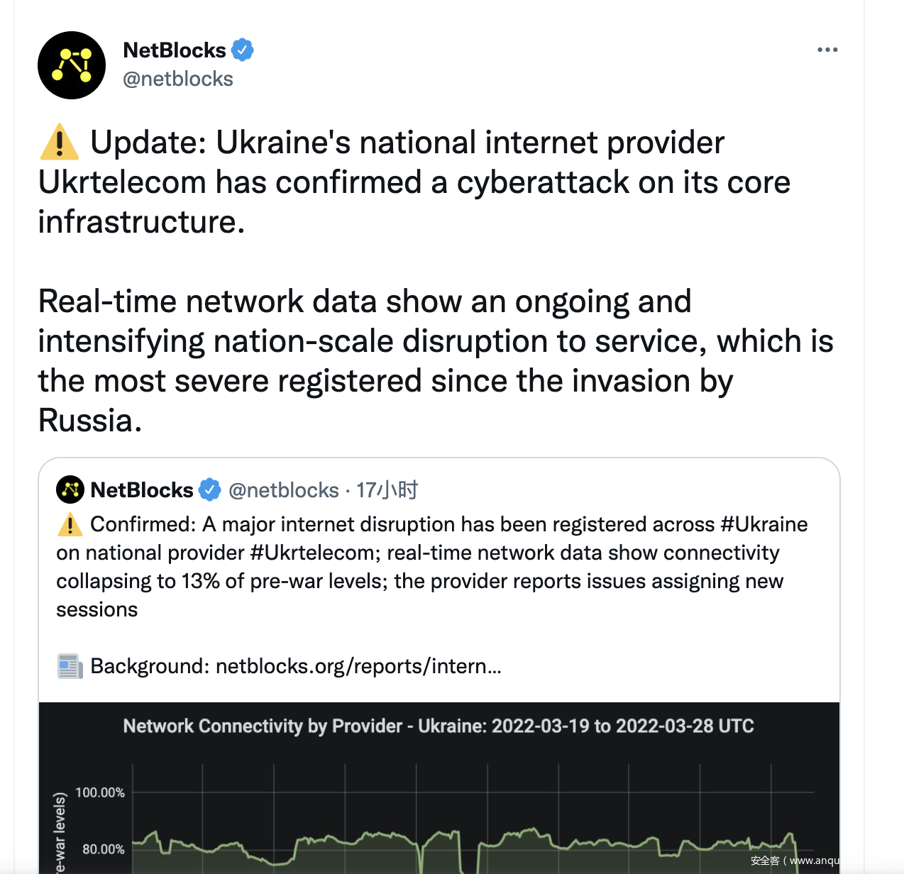 3月28日,外媒报道乌克兰通信商Ukrtelecom因遭遇重大网络攻击下线。当地时间上午11点左右开始,乌克兰电信客户的连通性在5个小时内急剧下降,截止美国东部时间下午2点50分,该公司的主要网站依然无法访问。