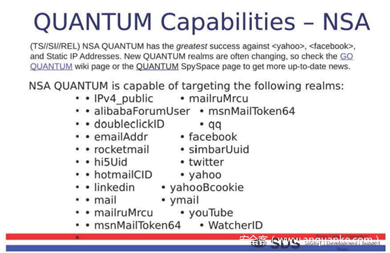 Quantum(量子)攻击系统均以英文单词QUANTUM开头命名,网上揭露的NSA机密文档中,详细描述了各QUANTUM系统模块的具体代号、主要功能、应用场景、项目状态和相关网络黑客攻击武器启用时间等。