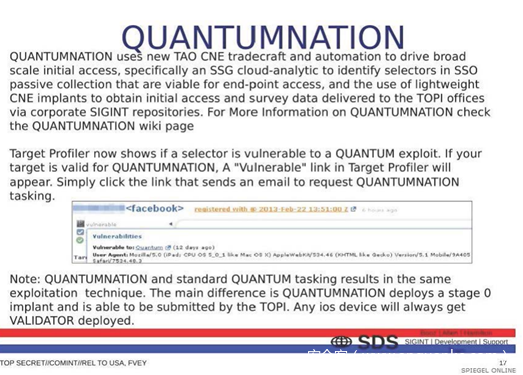 第一阶段,QUANTUM(量子)攻击实施者会首先对被攻击目标进行网络定位,整个定位过程是通过NSA持有的一整套“QUANTUM Capabilities”(量子能力),网络黑客攻击工具完成,这些工作具有对全球互联网巨头网络流量的远程劫持操控能力。