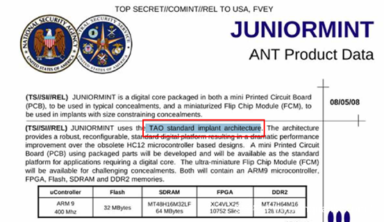 2013年,安全专家Jacob Appelbaum曝光了一份长达50页的NSA机密文档《NSA ANT catalog》[2],该文档描述了一系列名目繁杂的高端网络黑客攻击技术和项目。据该文档内容显示,相关的网络黑客攻击技术和项目创建于2008年前后,它们可以认为是为美国国家安全局下属接入技术行动处(TAO)专门定制研发的先进网络攻击武器。