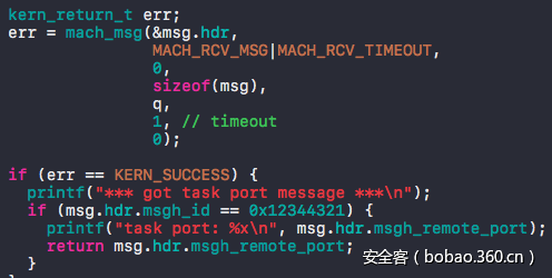 随后,攻击端会接收mach msg,如果获取到的msgh_id为0x12344321的消息,说明我们成果得到了目标进程的task port: