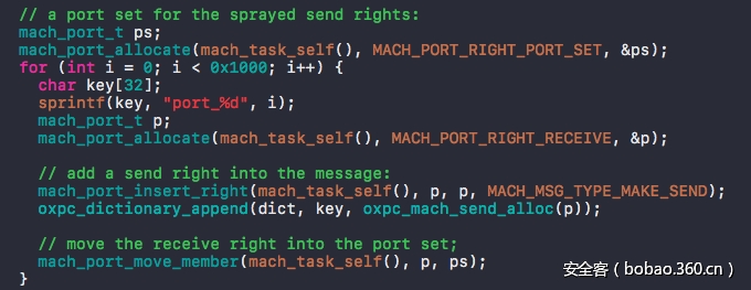 控制了stack就可以很容易的写rop了。但是beer目标不仅仅是执行rop,它还希望获取目标进程的task port并且执行任意二进制文件,因此除了exp,攻击端还用mach msg发送了0x1000个带有send right的port到目标进程中: