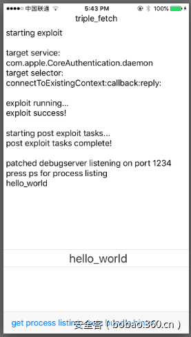 其实这个exp不但可以执行debugserver,还可以用来在沙盒外执行任意的二进制文件。只要把pocs文件夹下的hello_world二进制文件替换成你自己的想要执行的二进制文件,编译安装后,点击ui中的exec bundle binary即可: