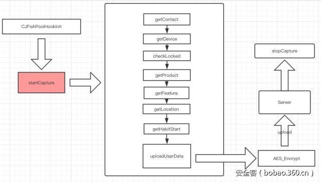 在初始化过后,开启捕获用户信息startCapture。这其中包含获取用户联系方式(getContact),获取设备信息(getDevice),判断设备是否需要上传信息(checkLocked),获取应用ID(getProduct),获取设备上的应用列表(getFeature),获取地理位置(getLocation),获取启动时间(getHabitStart)。