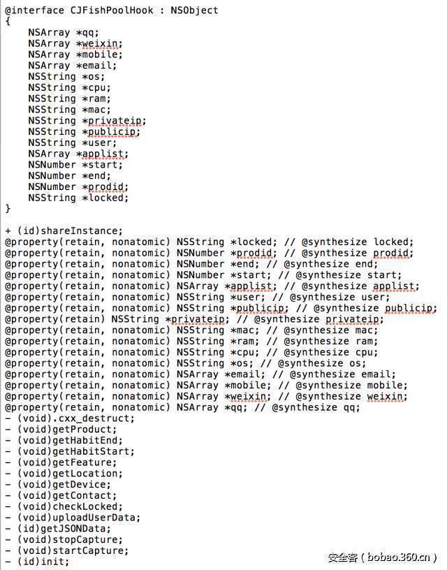 从导出结果来看,很可疑的是CJFishPoolHook类,该类有多达16个成员, 写该动态库的程序员非常老实,没有进行任何加密、混淆类名、方法名的操作,因此从字面上也不难猜出其含义为qq号、微信号、手机号、邮箱号、操作系统、CPU类型、内存、MAC地址、内网IP、公网IP、用户名、应用列表、设备ID,是否上传信息、开启应用和关闭应用的时间。