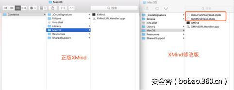 直接对比正版和破解版的包目录, 在包中我们发现了多出来的2个dylib文件