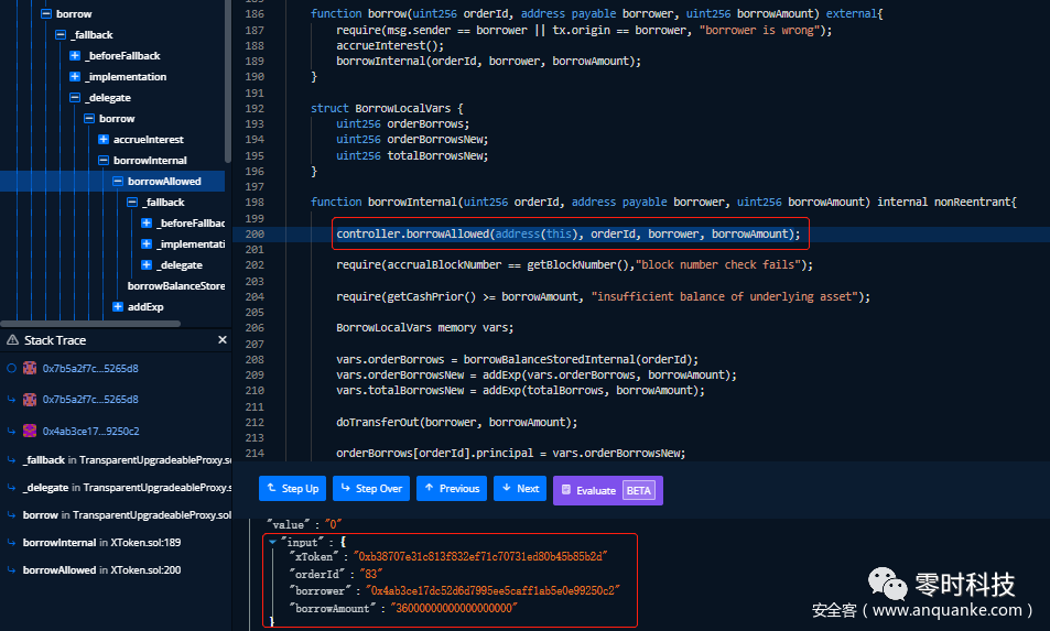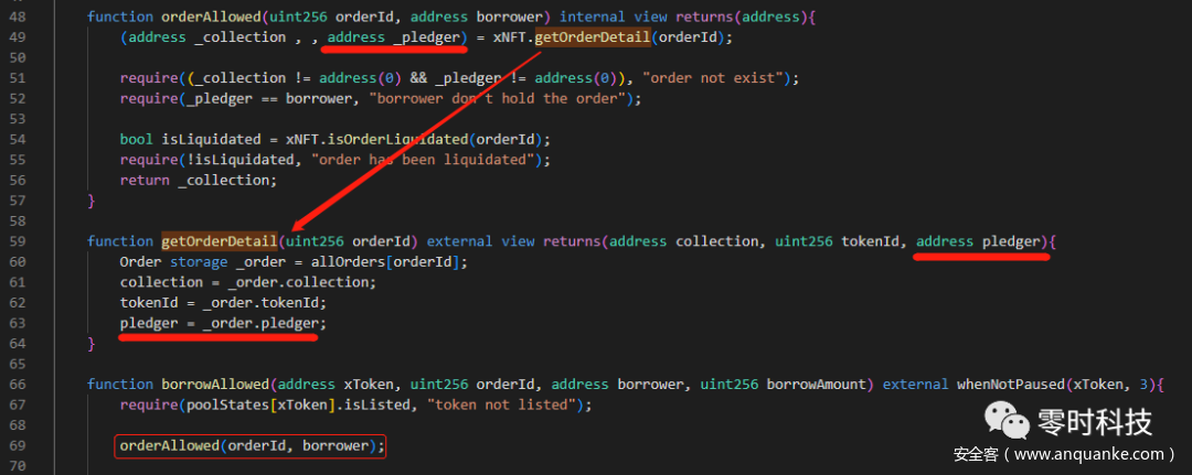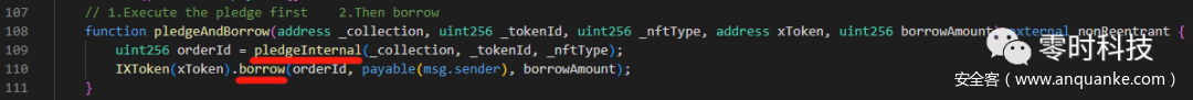 攻击者通过多次质押借贷和取出NFT操作增加了攻击者相关地址和 orderId 的对应性,之后调用Xtoken合约进行借款,由于借款时检查的是攻击者质押的订单id地址,所以攻击者可以通过多次调用借款传入之前的订单id,获取大量借款。
