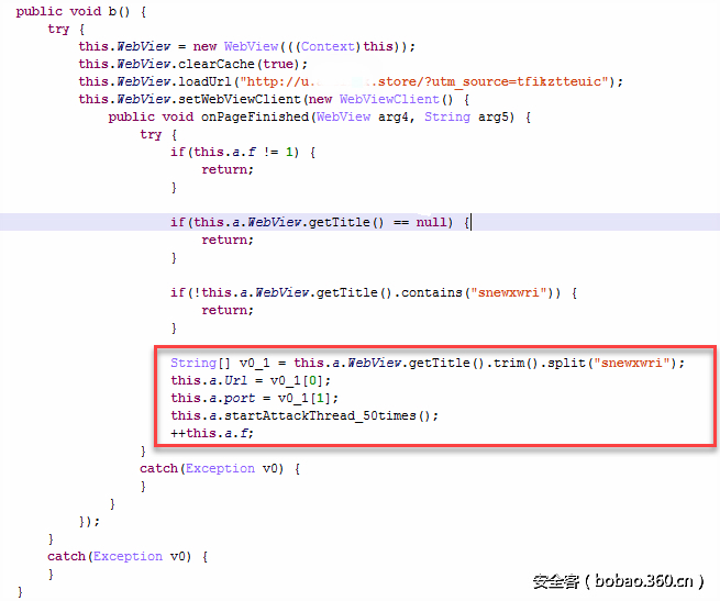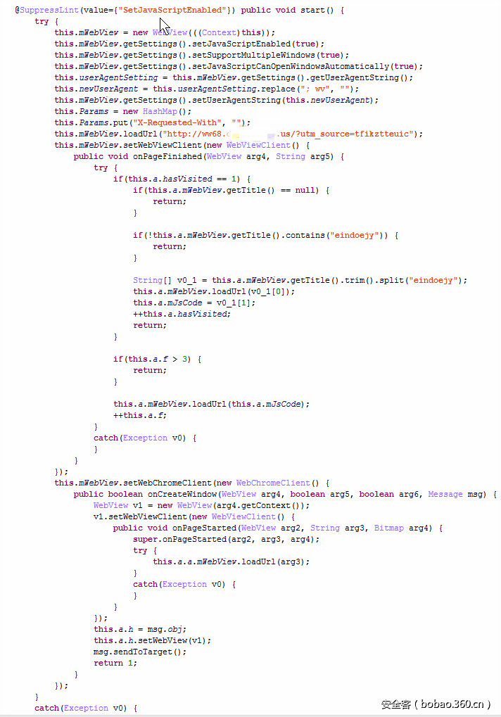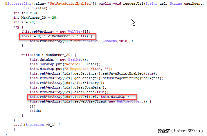 获得要攻击网站用到的URL、UserAgent和Referer后,会创建20个Webview,然后使用每个WebView访问要攻击的网站,代码实现如下: