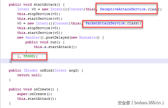 上述几种攻击的实现都是位于某个Android Service中,那么这几种攻击是怎么启动的呢?通过逆向分析APK得知, 该APK注册了监听某些事件的Broadcast Receiver,比如network connectivity change、device admin enabled等,在这些Receiver中,会启动Attack Controller这个Service, Attack Controller负责启动各种Attack,代码实现如下:
