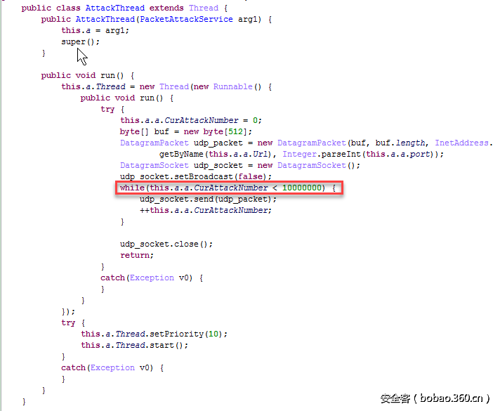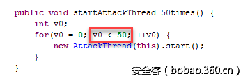 不同的变种,实现方式有些差别,攻击的强度也又有所差别,这个变种中,每隔55秒都会重启一次攻击。